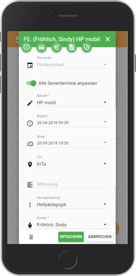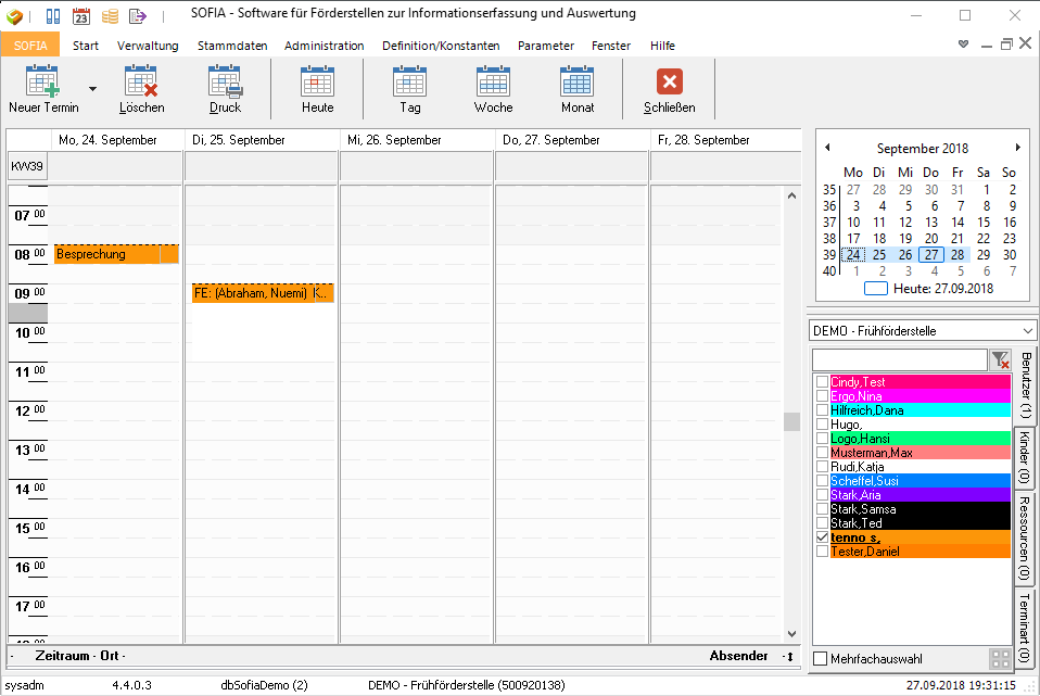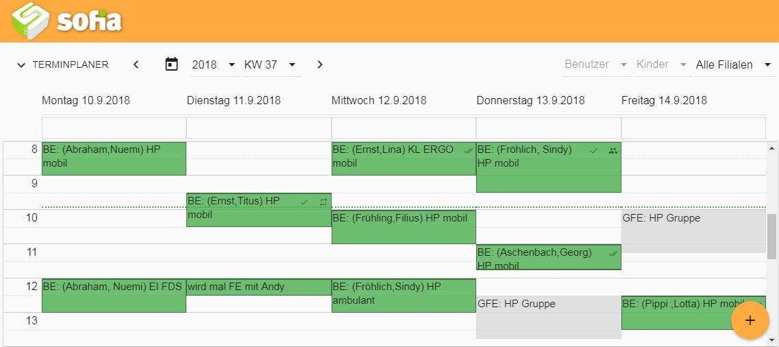Der Kalender dient als Planungs-, Erfassungs- und Dokumentationsplattform für die Praktiker in SOFIA. Er bietet Ihnen die Möglichkeit Einzel-und Serientermine, Gruppenfördereinheiten, Facharbeiten und Touren zu erfassen. Alternativ können Verwaltungskräfte die Leistungen über die Schnellerfassung eingeben. Der SOFIA Kalender kann mit Outlook synchronisiert werden. Auf die Termine können Sie bequem von unterwegs über den SOFIA-WebClient zugreifen.